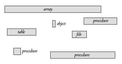 However, this is not necessarily the programmer's view of memory. Memory may be viewed as being full of objects, such as procedures, arrays, structures... Programmer's view is of many, small (and not so small) 1D address spaces: